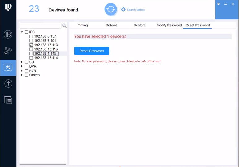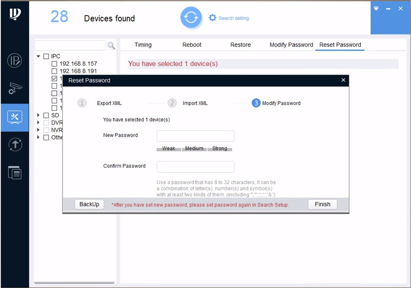 Bước 1 mở Config Tool --> System Settings --> Reset Password --> Chọn camera cần khôi phục mật khẩu