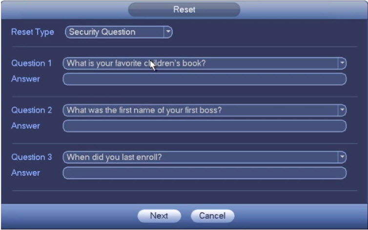 Trả lời 3 câu hỏi bảo mật bằng các câu trả lời mà bạn đã nhập ở các thiết lập ban đầu khi cài đặt đầu ghi hình