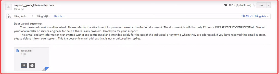 Một email có chứa file "result.xml" sẽ được gởi tới mail của bạn đã thiết lập. Tải file "result" về