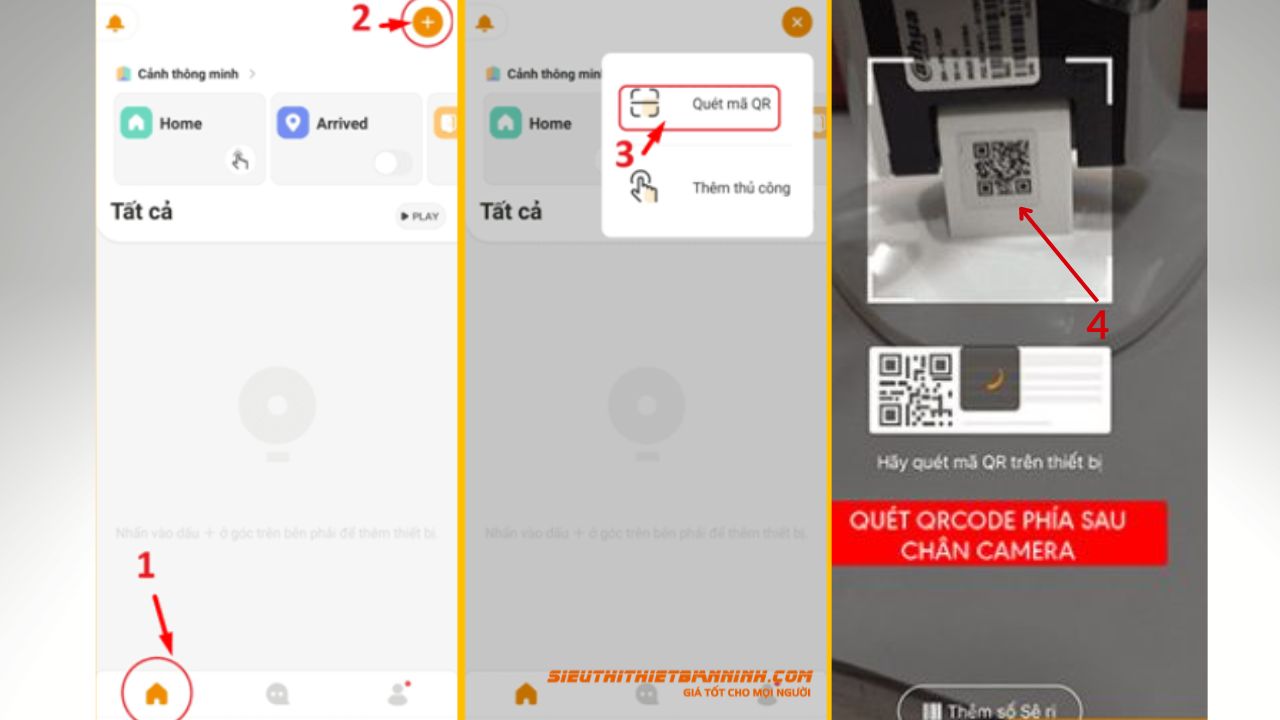 - Chọn "Quét mã QR" hoặc "Quét mã vạch" trên camera IMOU của bạn để kết nối nhanh chóng hoặc chọn "Thêm bằng tay" nếu bạn muốn cài đặt bằng cách nhập tay thông tin của camera.