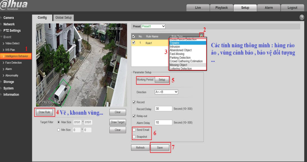 Các tính năng thông minh : Hàng rào ảo , Vùng cảnh báo , Bảo vệ đối tượng cách cài đặt tương tự như cài đặt tại đầu ghi mà hình đã hướng dẫn trong một File Word riêng biệt : Setup -> Event -> Intelligence Behavior