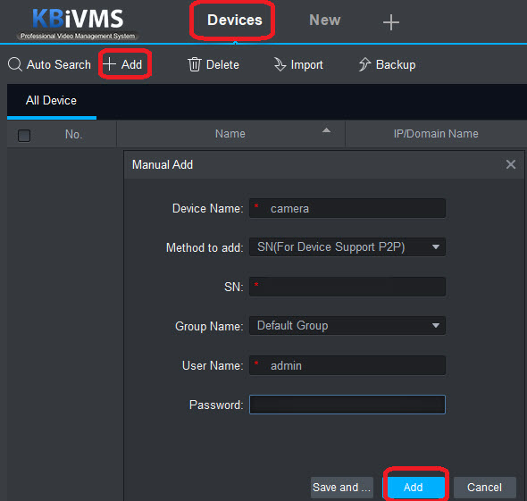 - Method to add: Nhấp vào và chọn SN(For Device Support P2P).