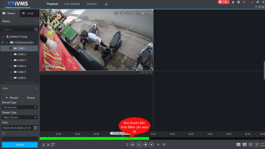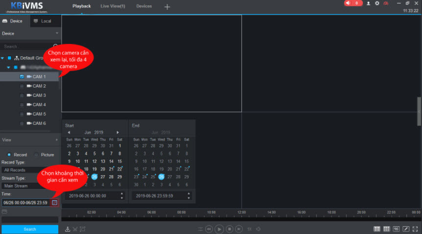 - Chọn camera cần xem lại > Chọn thời gian cần xem lại (các ngày có dấu chấm trên đầu màu xanh dương là có dữ liệu) chọn thời gian bắt đầu, thời gian kết thúc cần xem. > bấm nút Search nếu có dữ liệu thì sẽ có thanh dữ liệu màu xanh lá