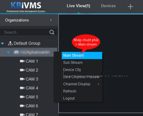 Click chuột trái vào phần Default Group như hình, click vào tên camera (tên đã tạo ở bước trên) cần xem > nhấp chuột phải lên tên của camera đã tạo trước đó. Phần mềm KBiVMS xuất hiện menu > chọn Main Stream