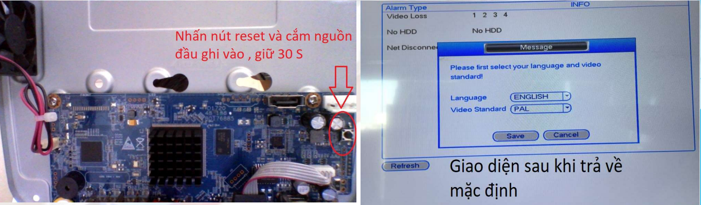 Bước 3: Nhấn nút Reset và cắm nguồn, giữ nút reset 30S sau đó thả nút ra cho đầu ghi khởi động vào trong