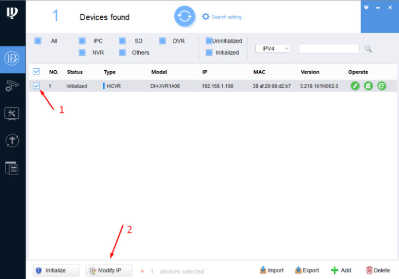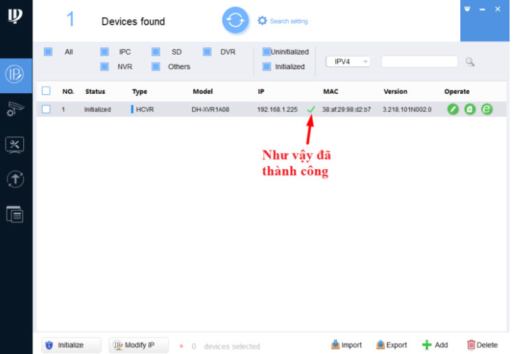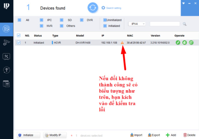 Sau khi tìm được địa chỉ IP để đổi IP chúng ta chọn thiết bị muốn đổi bằng cách tích vào ô đầu tiên của nó. Tiếp đến nhấn Modify IP.