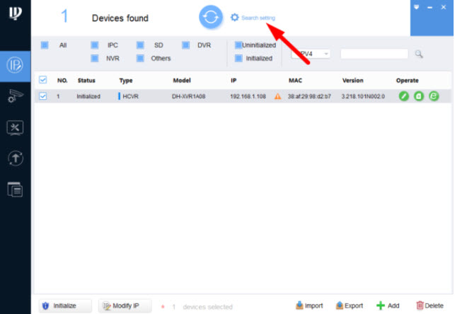 Chúng ta có thể cập nhật lại mật khẩu của camera Dahua hay đầu ghi trên phần mềm bằng cách kích vào biểu tượng Search setting