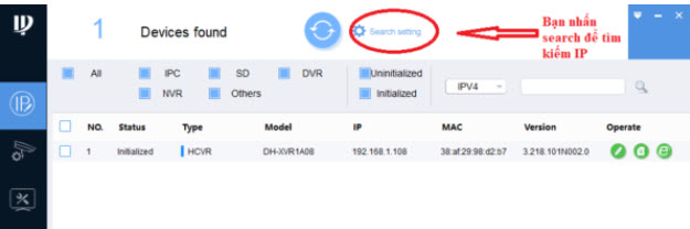 Sau khi cài đặt xong Config Tool bạn mở giao diện lên mà nhấn vào Search Setting để tìm IP.