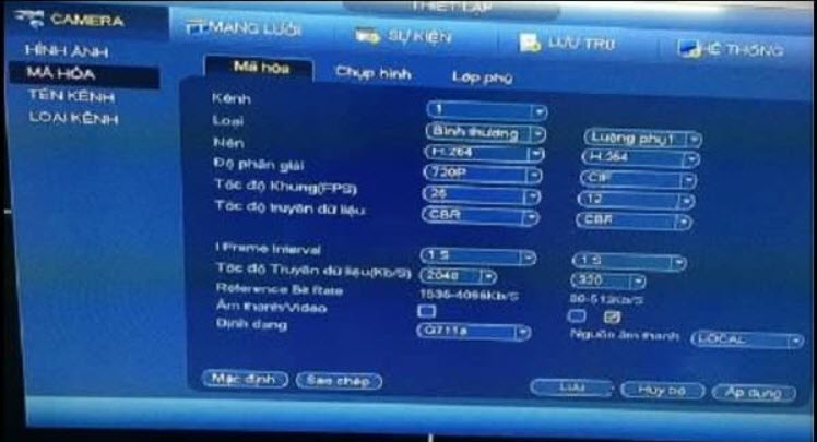 - Tốc độ truyền dữ liệu: Kiểu tốc độ ghi, hệ thống hỗ trợ hai kiểu: CBR và VBR. Ở kiểu VBR, có thể thiết lập chất lượng của hình ảnh.
