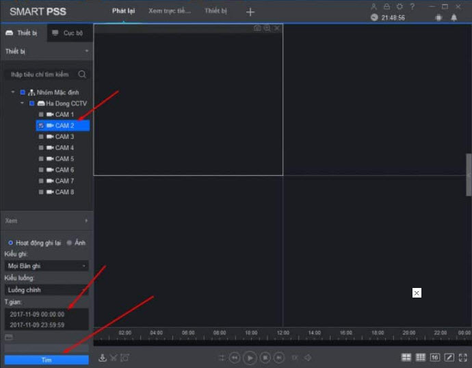 Trên giao diện chính các bạn vào mục Phát lại --> chọn camera --> chọn thời gian và tìm dữ liệu chúng ta muốn xem camera